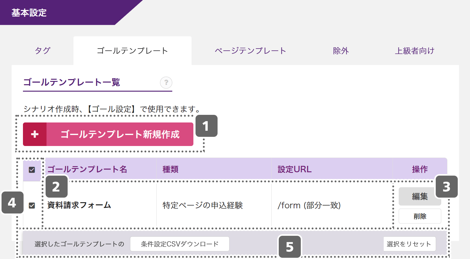 - ページ左下の「基本設定」をクリックし、基本設定画面の「ゴールテンプレート」を表示してください。