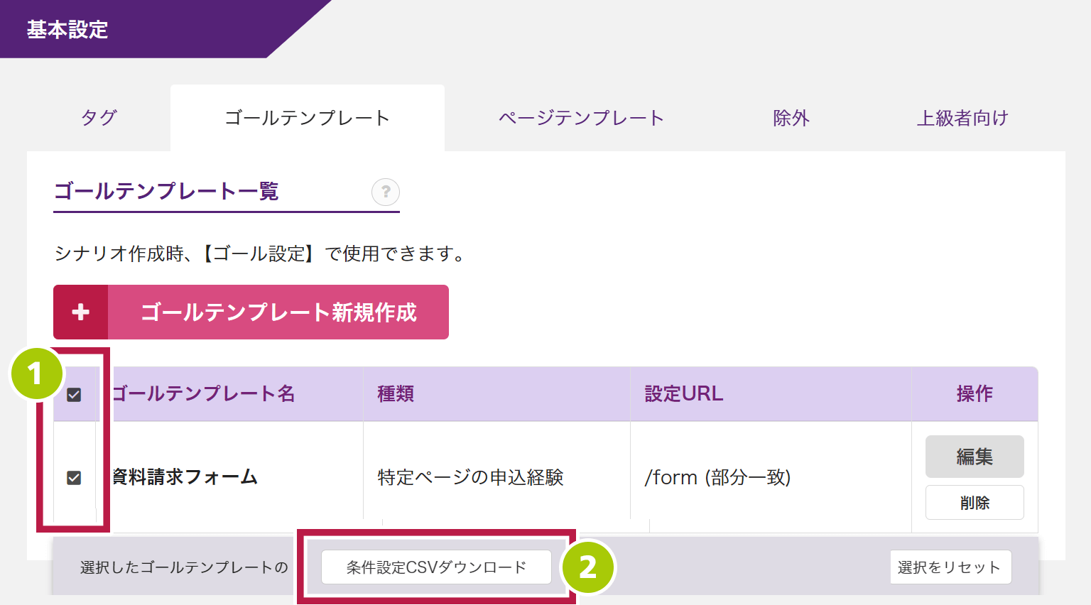 ゴールテンプレートに設定した条件をCSVファイルでダウンロードすることができます。