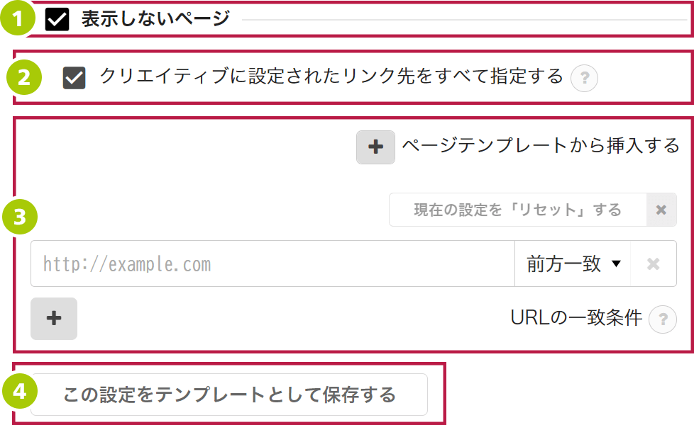 - 「クリエイティブに設定されたリンク先をすべて指定する」にチェックを入れると、クリエイティブに設定しているURLを「完全一致」で非表示ページに設定します。