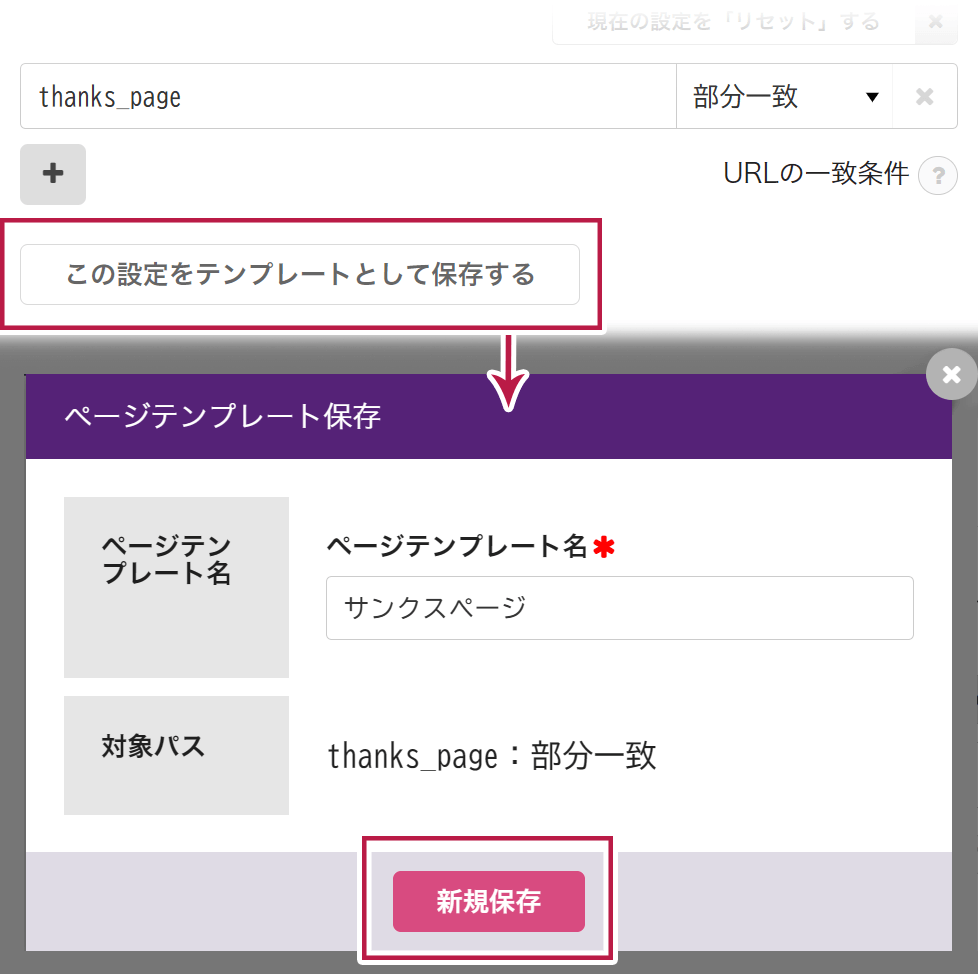 「この設定をテンプレートとして保存する」ボタンをクリックすると、「ページテンプレート保存」画面が表示されます。